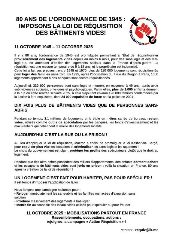 Le 11 octobre sera partout en France le lancement d'actions pour la réquisition (Paris, Rennes, Nantes, Grenoble, Toulouse...)
