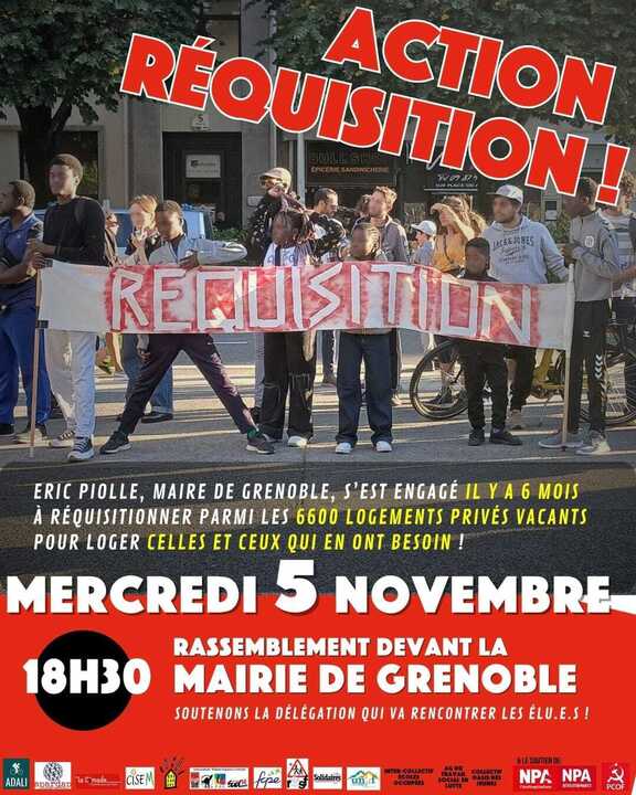 Plus d'une quinzaine d'organisations appellent à se rassembler le mercredi 05 novembre à 18h30 devant la mairie de Grenoble pour la réquisition des logements vides. Une délégation sera reçue par des élu.es de la ville de Grenoble au même moment. Nous espérons compter la présence du maire de Grenoble, que nous avons demandée à plusieurs reprises.